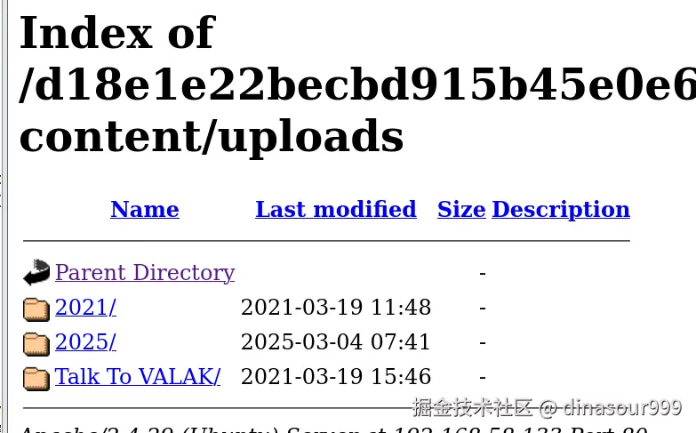 打开ihttp://192.168.58.133//d18e1e22becbd915b45e0e655429d487/wp-content/uploads/发现文件泄露
