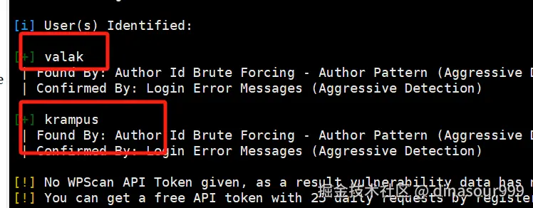 6.使用wpscan --url http://192.168.58.133/d18e1e22becbd915b45e0e655429d487/ -e u --ignore-main-redirect --force命令扫出用户名( krampus和valak)