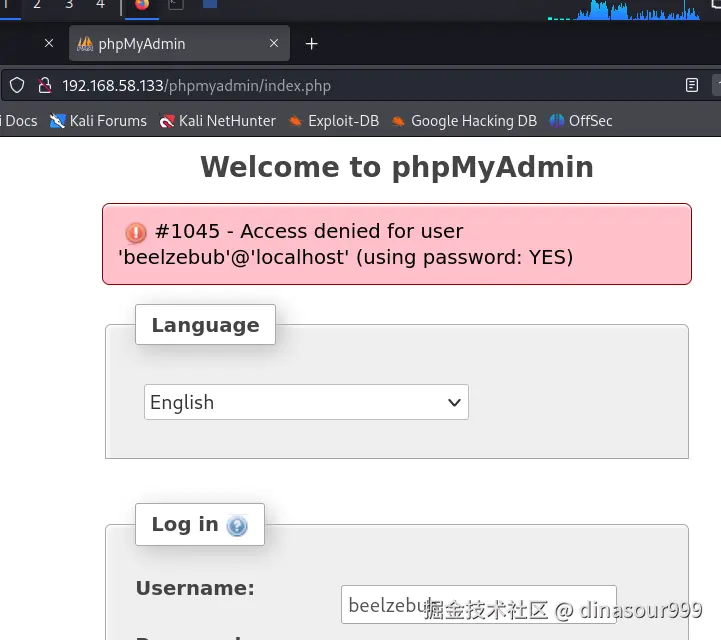 3.不妨拆beelzebub为用户名,解密的值为密码,在phpmyadmin登录,结果报错