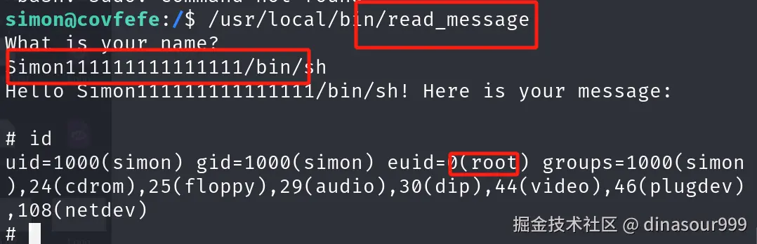 在这我们输入Simon111111111111111/bin/sh,提权成功