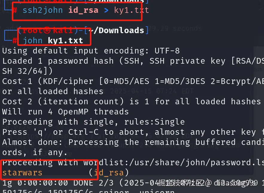 给个权限再执行,显示要密码,所以我们要ssh2john先把私钥进行解密 再用john把明文密码解出来