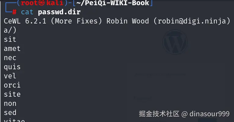 里面提示我们用工具cewl(收集网站可能的密码信息的),用命令cewl dc-2 >passwd.dir