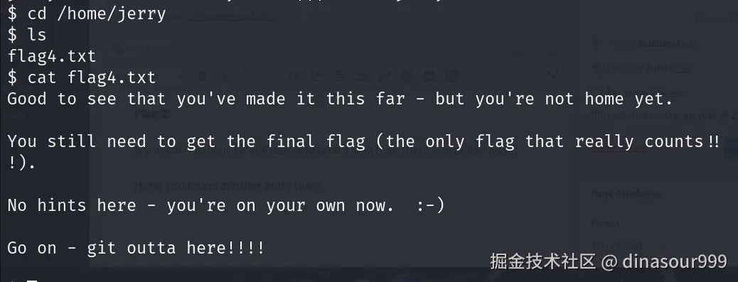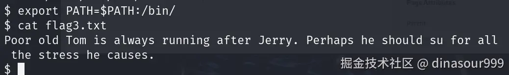 里面的内容提示找到最终flag可以利用git提权到root,但tom用户提示找不到git命令,结合上面flag3提示进到jerry用户