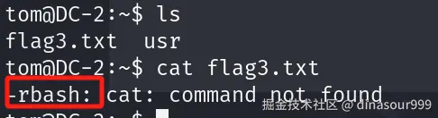 接下来进行提权,ls看一下有什么,发现一个flag3,cat发现有rbash(限制我们各种命令的手段)