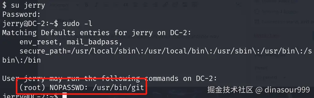 内容提示让我们水平越权到Jerry用户,因为可能存在sudo提权,cat /etc/passwd发现Jerry家目录在/home/jerry