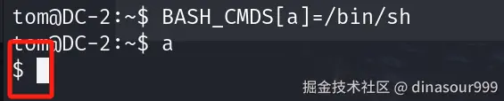 现在使用bash的关联数组BASH_CMDS(内置的)进行绕过 定义一个数组a=/bin/sh BASH_CMDS[0]=/bin/sh,再引用变量a就会执行/bin/sh进入到新的shell里