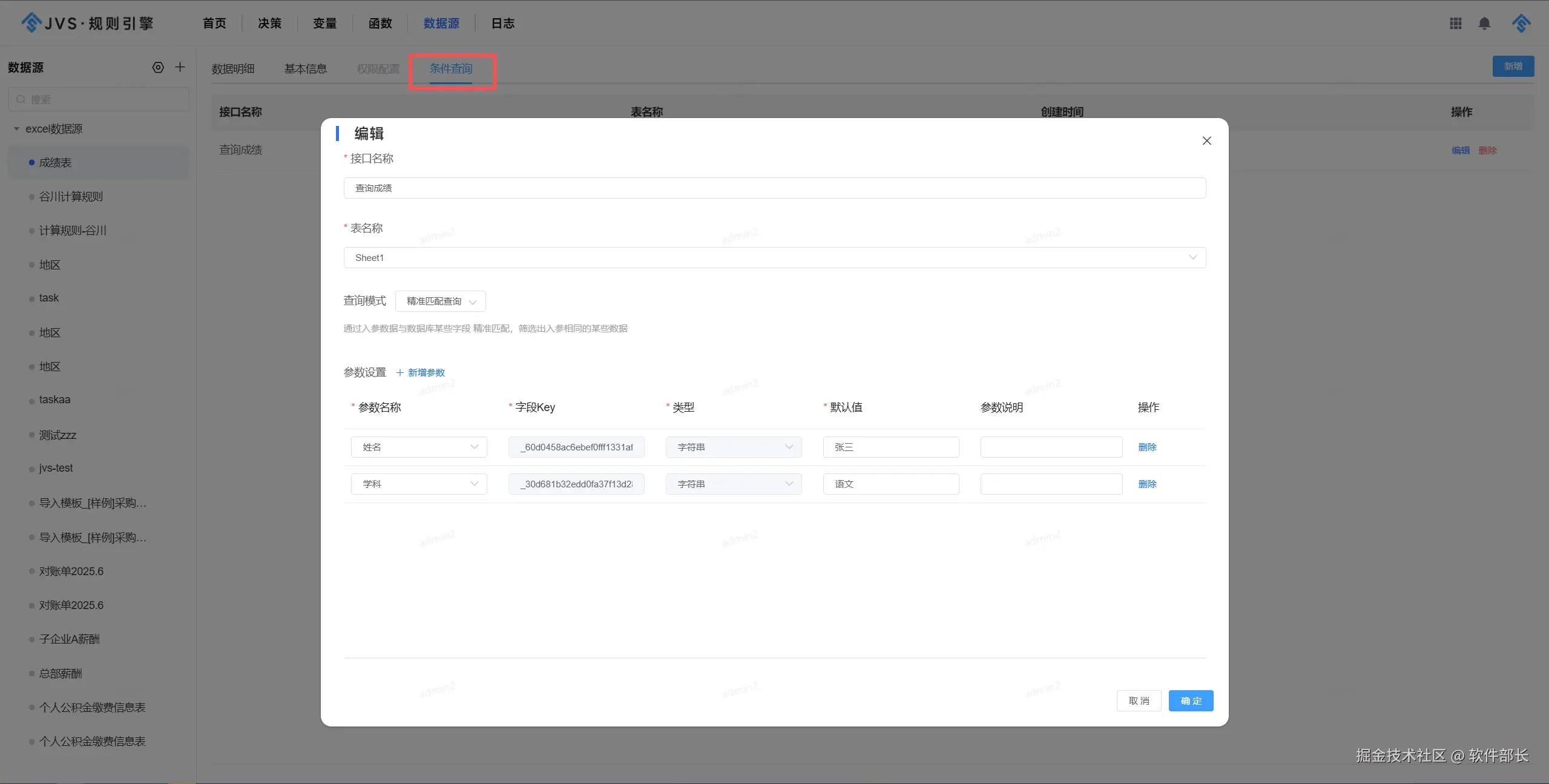 2、配置查询条件,可根据实际场景配置。此处需要姓名和学科,即配置姓名和学科的查询条件并提供默认值。