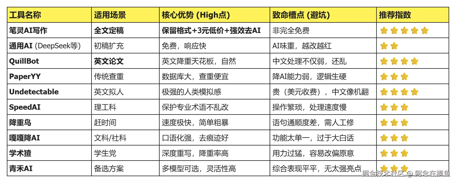 📊 10款降AI工具核心对比总表