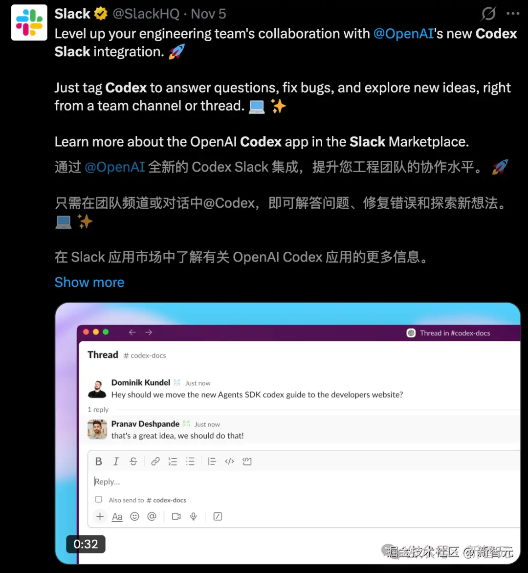 这种集成意味着,当有人在 Slack 里发反馈时,可以直接 @Codex 让它修 bug;它还会提一个 PR,团队成员可以在同一个帖子里审查代码并进行迭代。