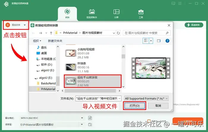 第一步:先运行数据蛙视频转换器,之后在软件内部单击 【添加文件】 按钮,即可导入您所的视频素材。另外,您也可以选择 【添加文件夹】 ,即可导入整个文件夹的所有音视频。