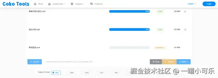 通过Coko Tools在线网站,视频转音频怎么转?用户不仅可以批量导入视频素材,而且不限于MP4、MOV、WEBM等视频格式。如何把视频的声音转换成音频?在该网站中,大体积的视频也可以上传,您可以添加最多2GB的视频。但是,该网站的转换速度偶尔会比较慢。