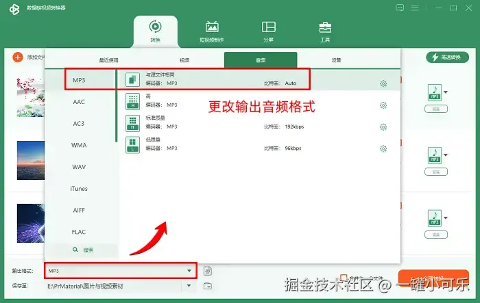 第二步:点击 【输出格式】 ,在 【音频】 选项卡当中,列表的左侧是各种音频格式,点击首位的 【MP3】 格式。在右侧是各种音质参数,如 【与源文件相同】【高质量】 等。