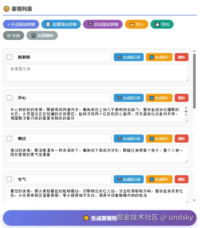 + 批量添加表情:点击后输入表情名称,调用大语言模型自动生成