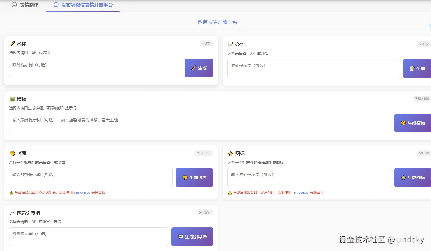 上下布局,上部为标题,微信表情开放平台,点击后跳转到微信表情官网:https://sticker.weixin.qq.com/,下部分为发布到微信表情需要的图片和文案,具体内容如下: