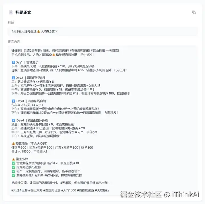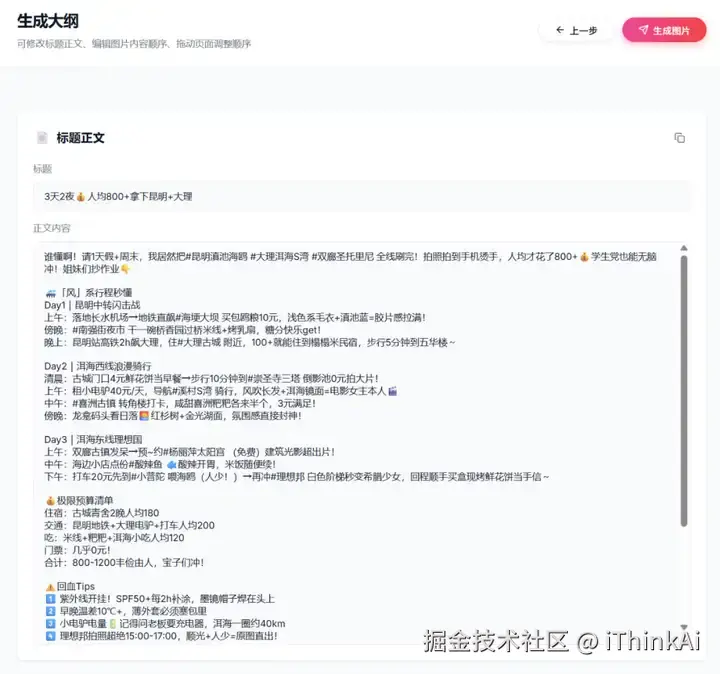 第一步,生成标题、正文、每张图的内容描述(含文案+配图)