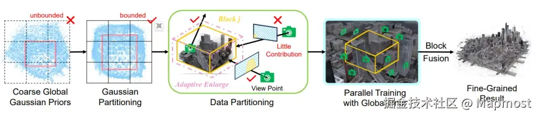 - 并行训练与融合:各区块独立训练完成后,裁剪边界外的高斯椭球,并拼接所有区块生成全局一致的模型。
