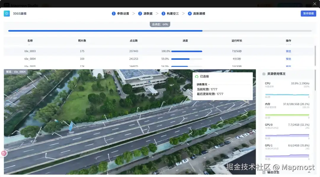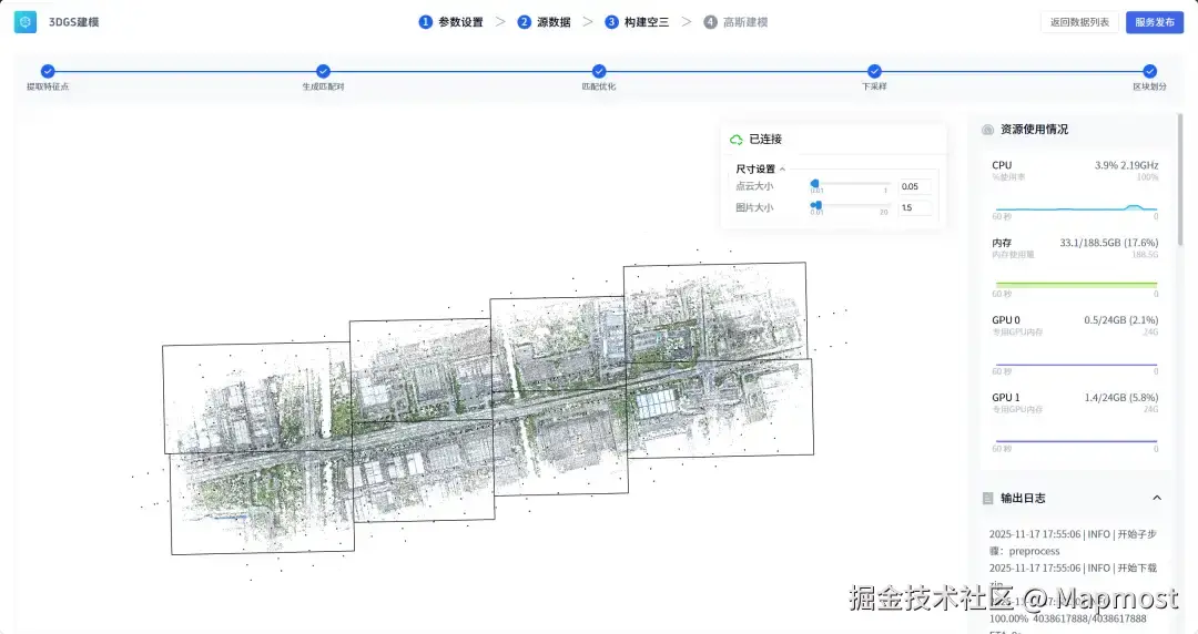 理论上的突破,终需落于工程实践。你只需专注数据与创意,剩下的交给Mapmost高斯泼溅建模平台——从智能分区、并行训练到无缝合并,全程自动处理,助你高效获得高质量、全局一致的3DGS模型。