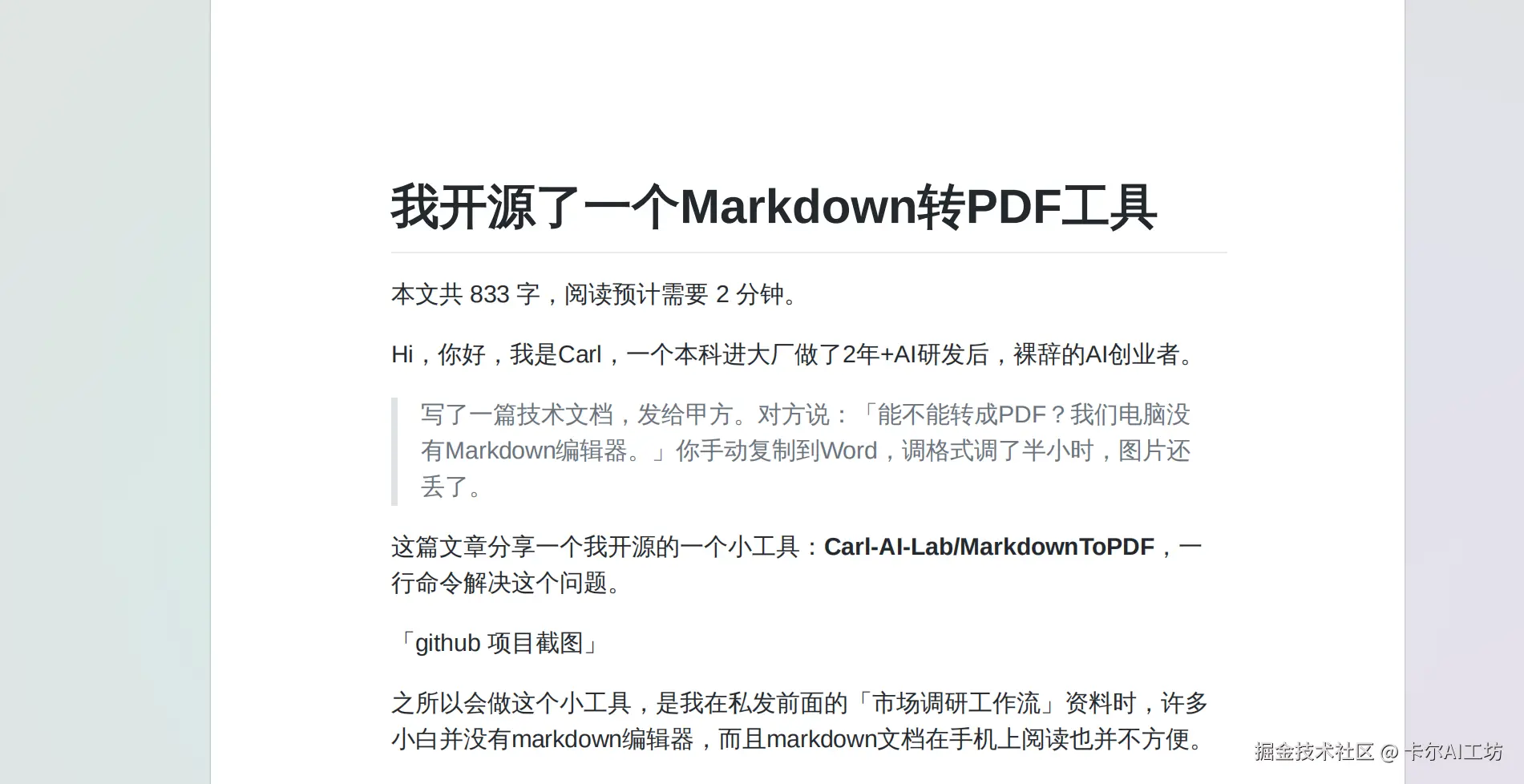 | 写了一篇技术文档,发给甲方。对方说:「能不能转成PDF?我们电脑没有Markdown编辑器。」你手动复制到Word,调格式调了半小时,图片还丢了。 |