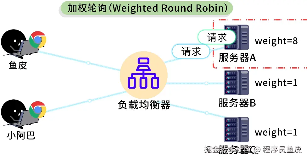 2)加权轮询(Weighted Round Robin) 就能解决这个问题,你可以给性能高的服务器设置更高的权重,让它处理更多请求。