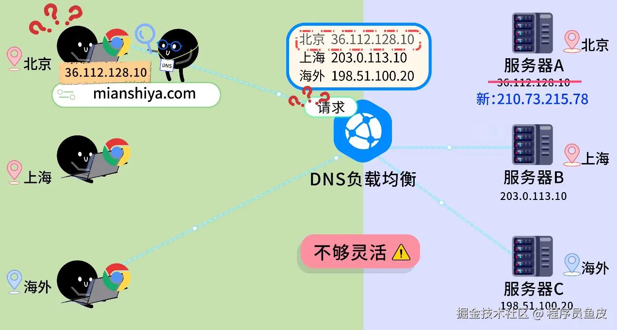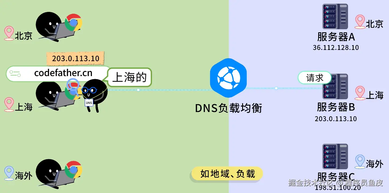 鱼皮:问得好,DNS 负载均衡 比较特殊。它严格来说属于应用层,但工作原理和前面讲的都不太一样。