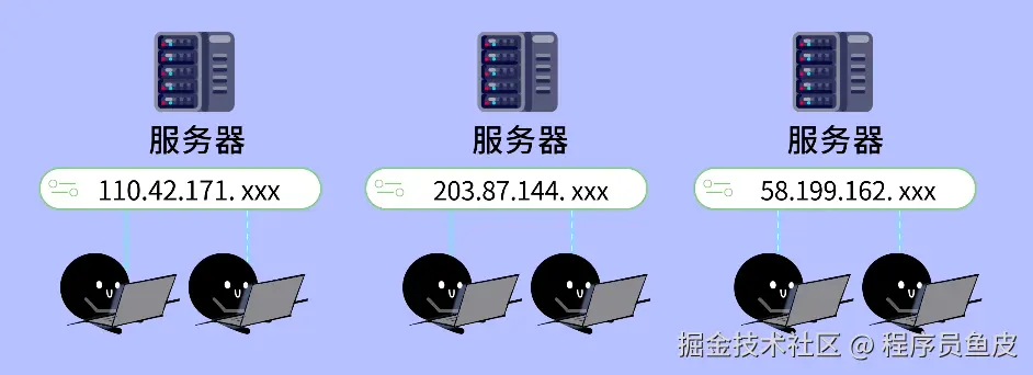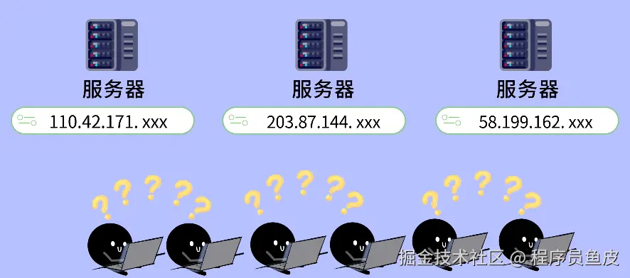 你恍然大悟:对哦,我买 3 台服务器,就有 3 个不同的 IP 地址了。只要让用户自己选择访问哪一台,就能分摊流量压力啦!