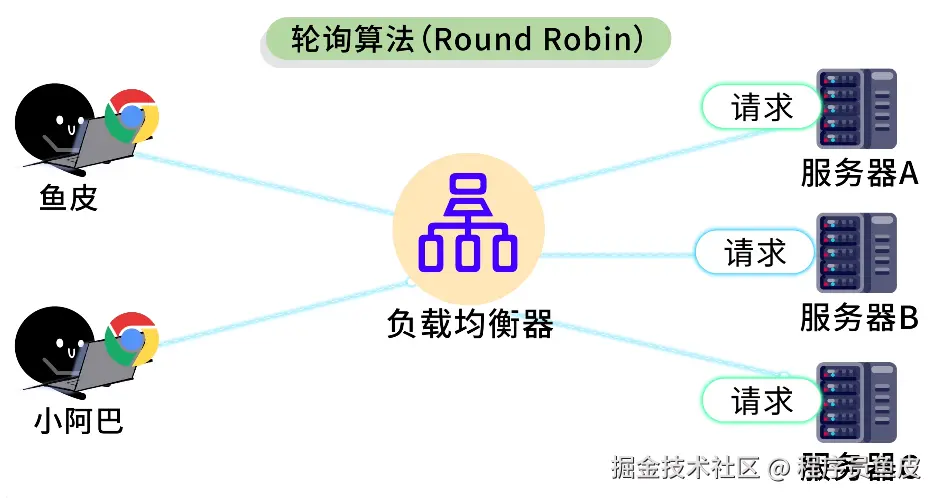 鱼皮笑道:算法千千万,轮询占一半。实际工作中,大部分场景用轮询或加权轮询就够了。