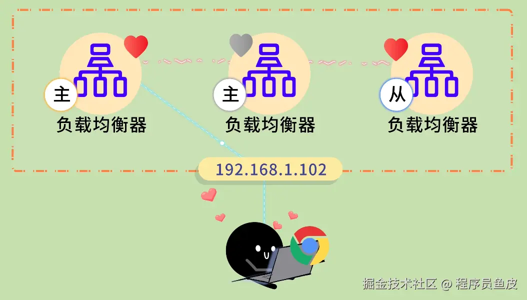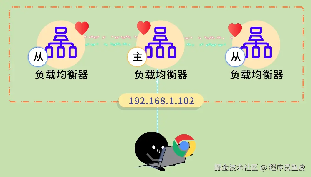 解决办法是部署多个负载均衡器,采用主从模式。主负载均衡器正常工作,从负载均衡器随时待命。它们之间会互相发送心跳包,并共享一个虚拟 IP 地址(VIP)。