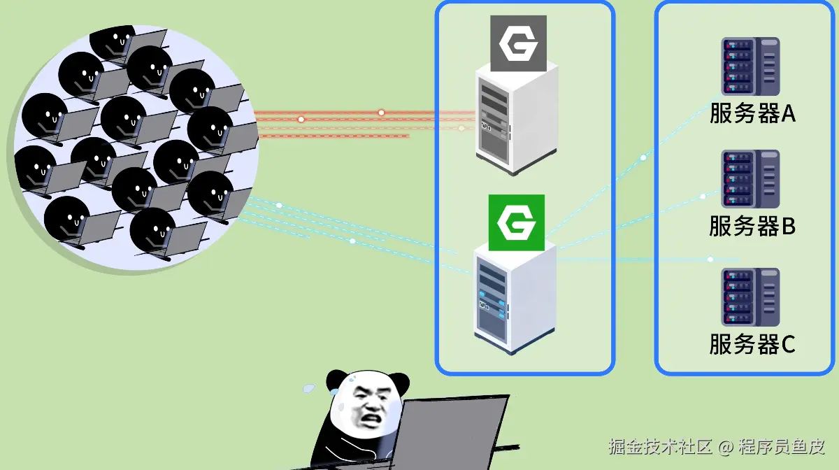 鱼皮:像 Nginx、HAProxy 等高性能网关软件都支持负载均衡功能。比如使用 Nginx,只需要写下这样一段配置: