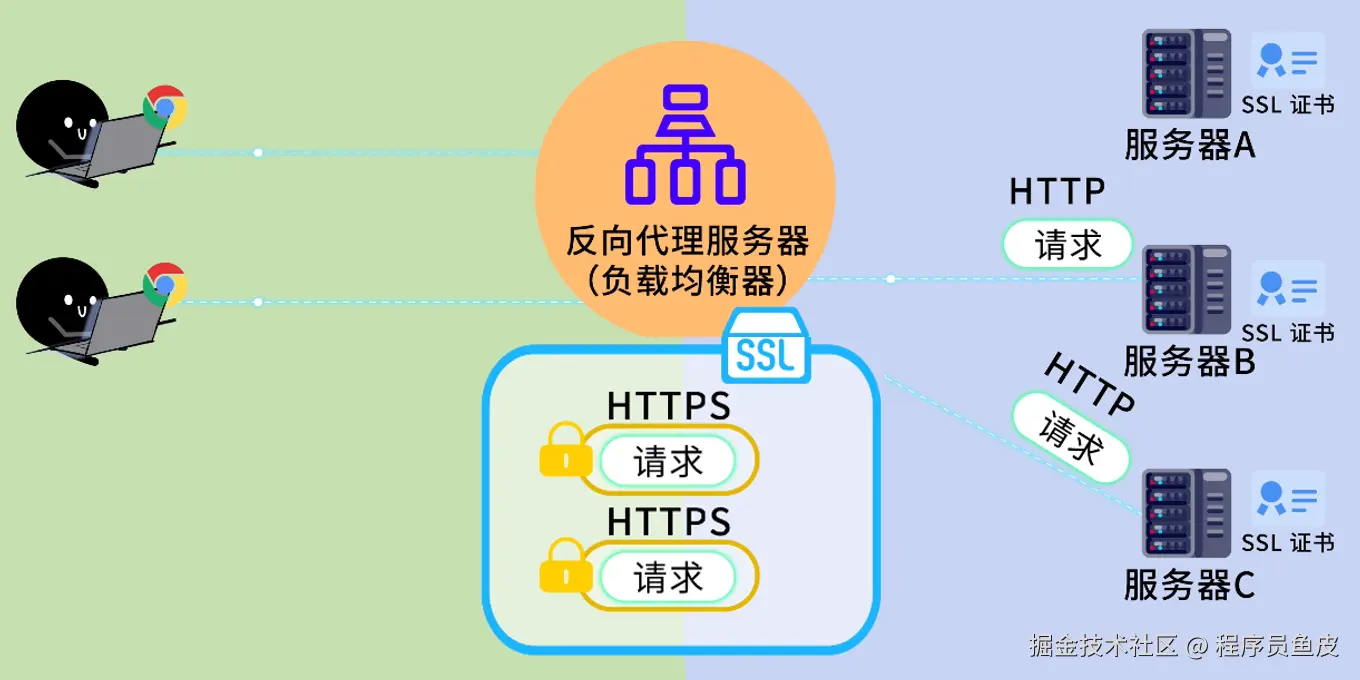 此外,负载均衡器在实际使用中,还常常承担一些额外的职责。比如 SSL 卸载,让负载均衡器统一处理 HTTPS 的加密解密,后端服务器就不用每台都配置证书了,省事儿又减压。