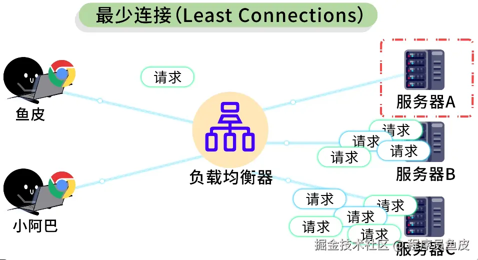 1)最少连接(Least Connections):哪台服务器当前连接数最少、最闲,就优先把请求分给谁。