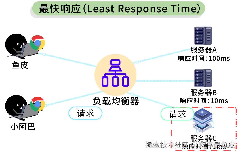2)最快响应(Least Response Time):哪台服务器的响应速度最快、干活最麻利,就优先把请求分给谁。