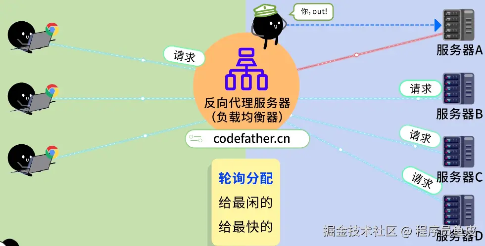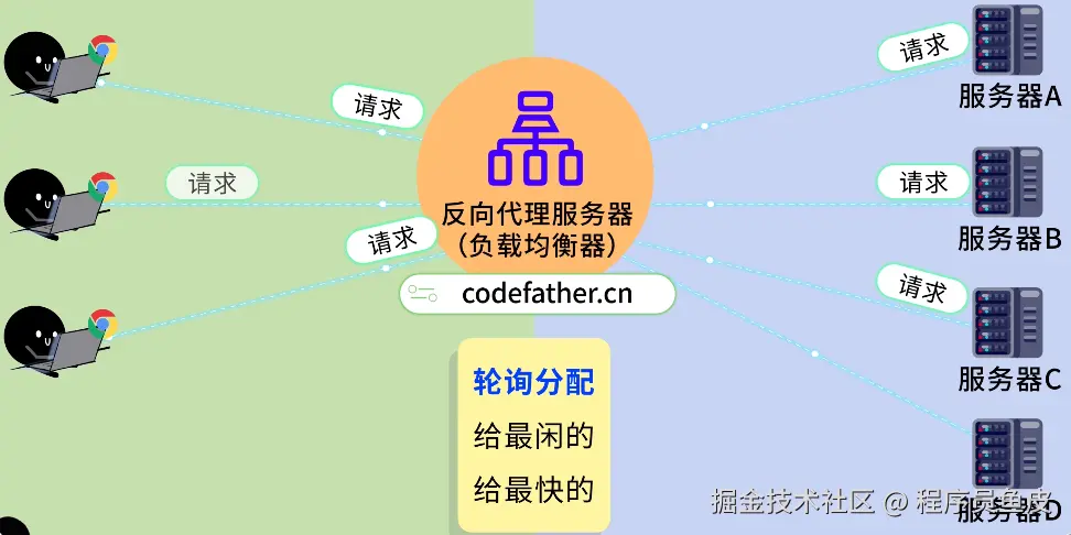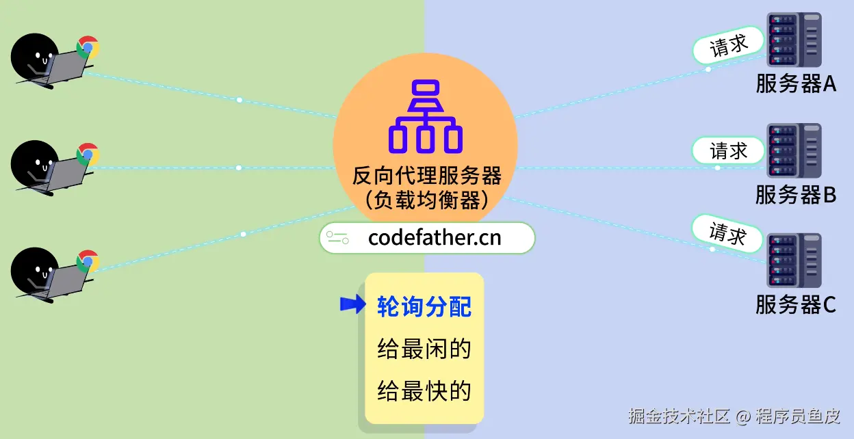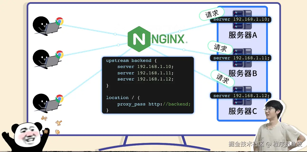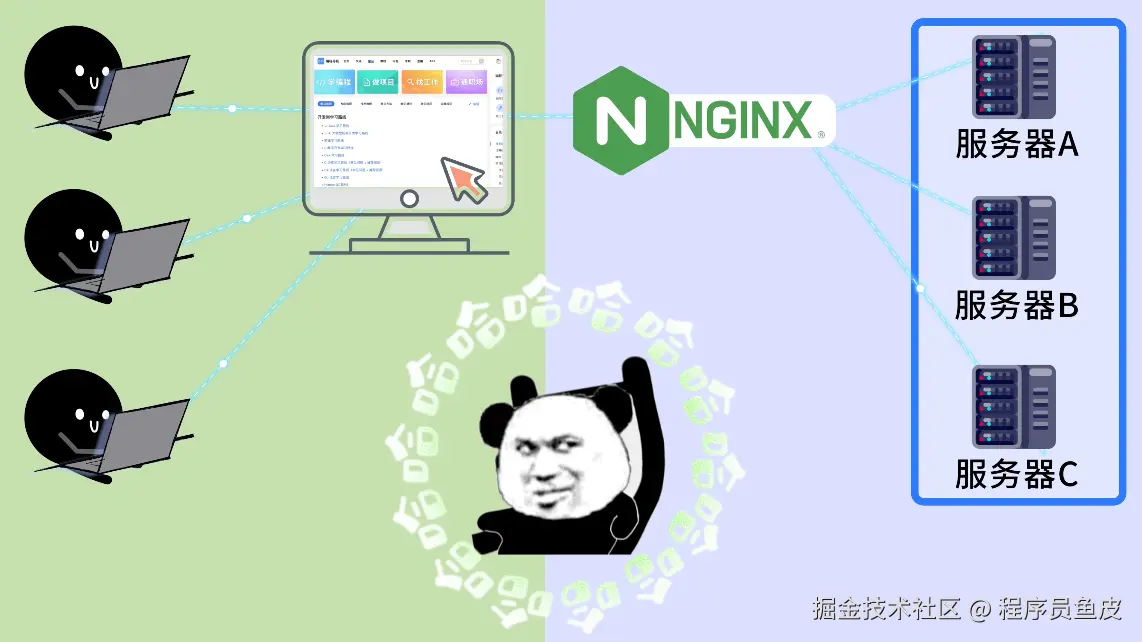 鱼皮从裤兜里掏出两个硬币砸到你的头上:想啥呢?!你现在只是了解了负载均衡的思想,但是实际开发中还有很多玩法。对了,我之前在 编程导航 分享过一个 Nginx 学习路线,建议你系统学习一下。