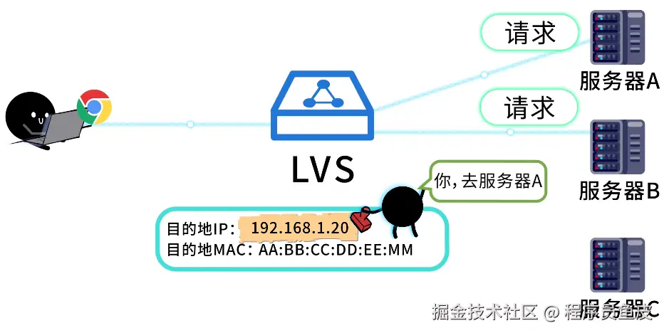 常用的实现方案是 LVS (Linux Virtual Server,Linux 虚拟服务器),它通过修改网络数据包的地址信息(IP 或 MAC),把请求转发到不同的服务器,速度极快。适用于某宝、某东这种级别的大型网站。