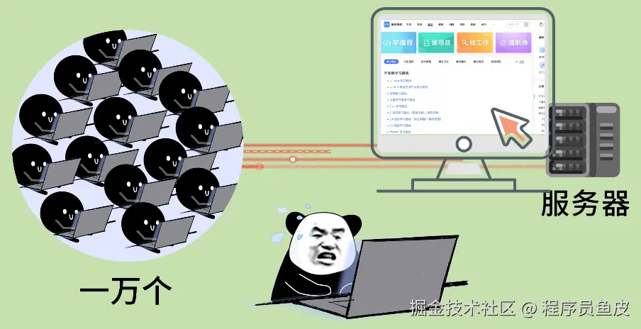 结果一周后,某知名博主 “鱼蛋” 不小心推广了 你的网站,突然来了 1 万个用户同时访问,直接把你的网站服务器冲爆了!