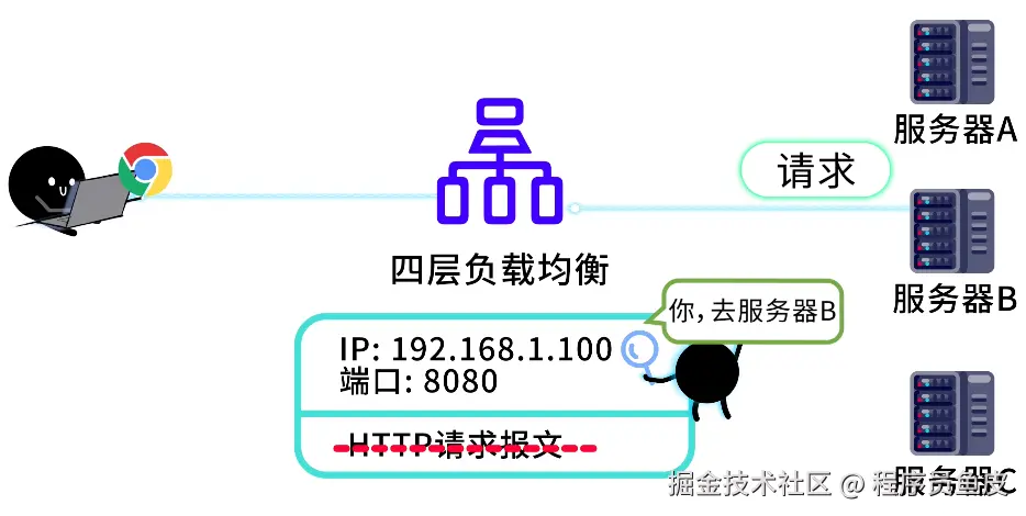 如果想更进一步增加并发,可以用 四层负载均衡。它工作在传输层,只根据 IP 地址和端口号进行转发,不关心 HTTP 请求的具体内容。