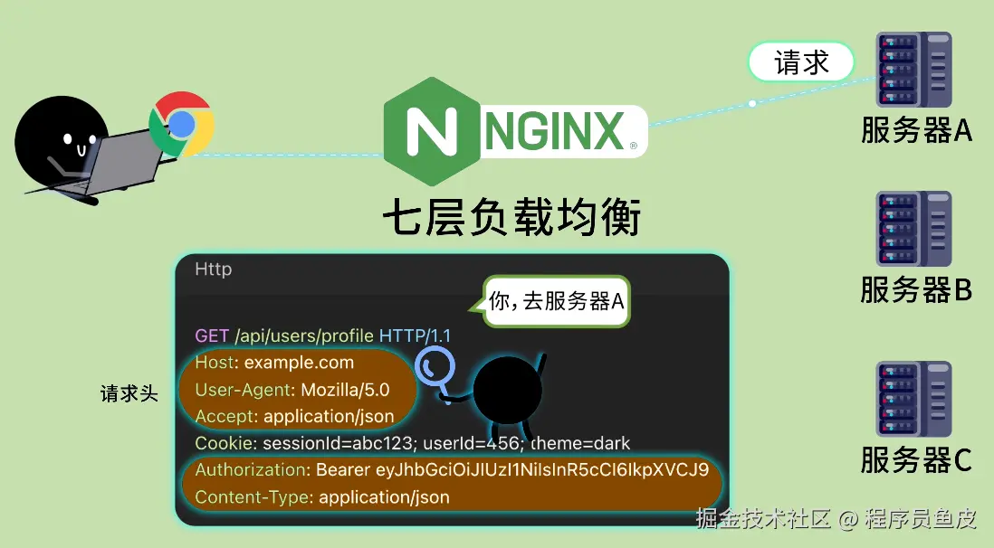 刚才你用的 Nginx,其实是 七层负载均衡。它工作在应用层,可以根据 HTTP 请求的内容(比如 URL 路径、Cookie、请求头等)进行转发。