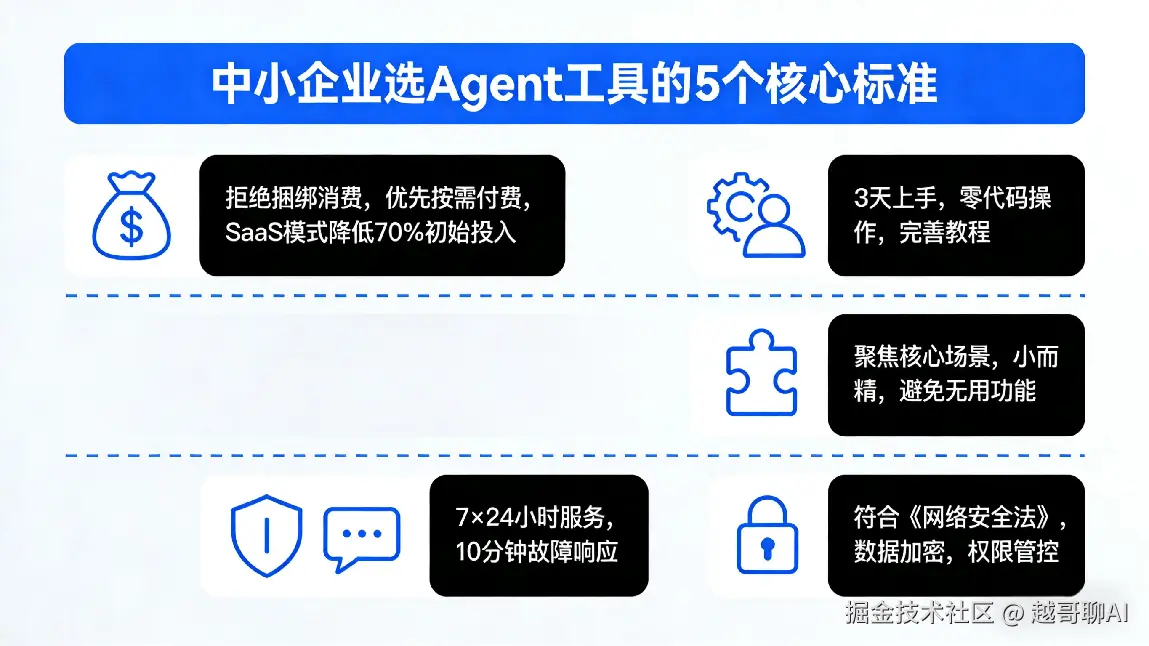 市场上的Agent工具五花八门,从免费的到一年几十万的都有,选不对真的会踩坑。结合上千家中小企业的使用经验,总结出5个核心标准,照着这些标准选,基本不会出错。记住,咱小企业选工具,别追“高大上”,要追“刚刚好”。