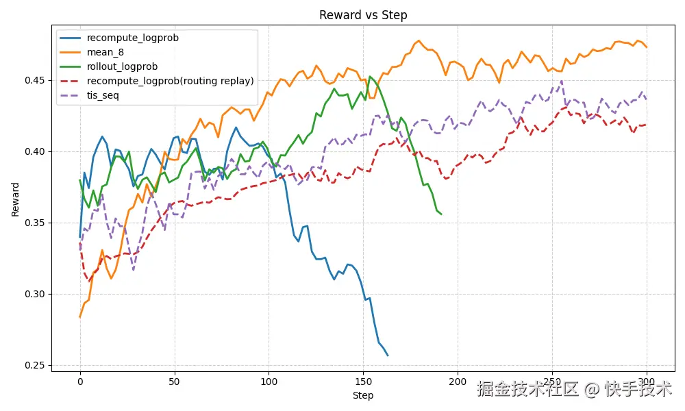 图中 mean_8(黄线)代表我们提出的抑制采样噪声方法,其余曲线为 TIS 等业界常用方法。对比可见,我们的方法能获得更好的训练效果。
