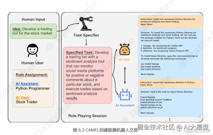 CAMEL最初的核心目标是探索如何在最少的人类干预下,让两个智能体通过"角色扮演"自主协作解决复杂任务。CAMEL实现自主协作的基石是两大核心概念:角色扮演(Role-Playing)和引导性提示(Inception Prompting)。