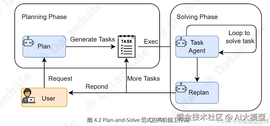 - 执行阶段(Solving Phase):在获得完整的计划后,智能体进入执行阶段。它会严格按照计划中的步骤,逐一执行。每一步的执行都可能是一次独立的LLM调用,或者是对上一步结果的加工处理,直到计划中的所有步骤都完成,最终得出答案。