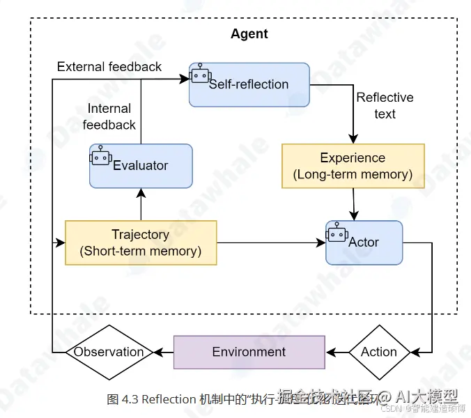 Reflection机制的核心思想是为智能体引入一种事后(post-hoc)的自我校正循环,使其能够像人类一样,审视自己的工作,发现不足,并进行迭代优化。它为智能体提供了一个内部纠错回路,使其不再完全依赖于外部工具的反馈(ReAct的Observation),从而能够修正更高层次的逻辑和策略错误。