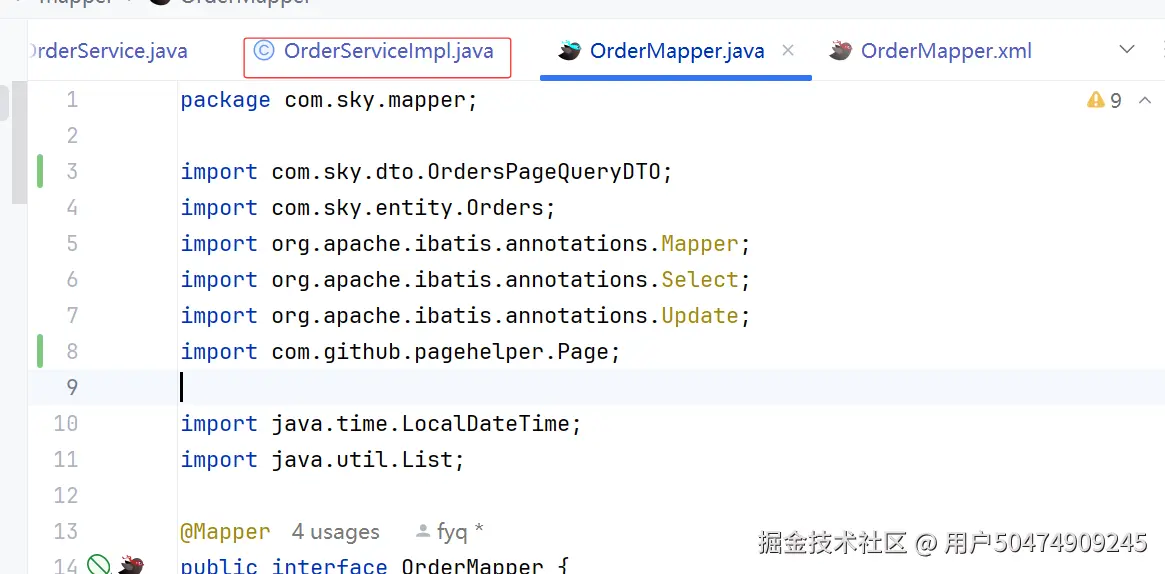 在苍穹外卖中,所有跟分页查询相关的全部用的是com.github.pagehelper.Page,如果这部分保险错了,那么很可能是因为引用错误。注意,这个是要在OrderServiceImpl,OrderMapper