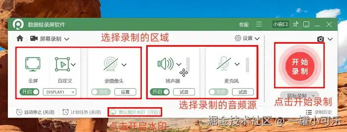 步骤2:进入 “屏幕录制” 功能界面后,可以灵活设定录制范围 (全屏或自定义区域均可) ,还能同步配置摄像头开启状态、音频采集源 (系统音/麦克风/双音轨) 等参数。如果需要添加专属水印,可以直接在 “图片水印” 设置模块中完成水印内容、位置及透明度的调整。所有参数配置完毕后,点击界面中的 “开始录制” 按钮,就可以启动屏幕录制了。