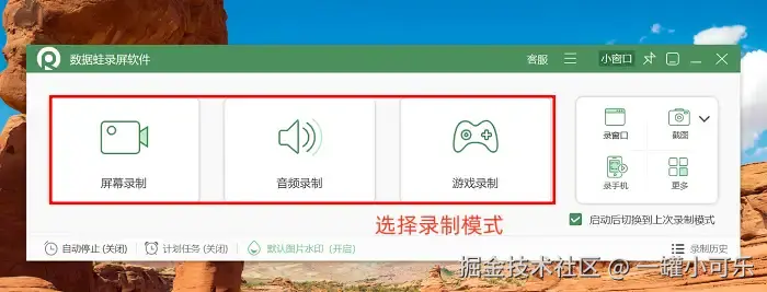步骤1:怎么录制屏幕视频?启动数据蛙录屏软件后,主界面会直观展示各类录制模式选项,用户可以依据实际录制需求进行挑选。本文会以 “屏幕录制” 模式为演示案例。
