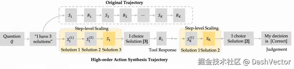 基于多风格问题和历史轨迹数据,我们分别构建了三种类型的动作数据,包含单步的规划、推理动作和多步的决策动作合成。我们的方法能够在离线环境下大规模、全面地探索潜在的推理‑动作空间,从而消除了对额外商业工具 API 调用的需求。例如,对于决策动作合成,我们将原始轨迹中的步骤进行扩展,并最终建模成多步骤决策过程数据,以激发模型的探索能力和决策能力。