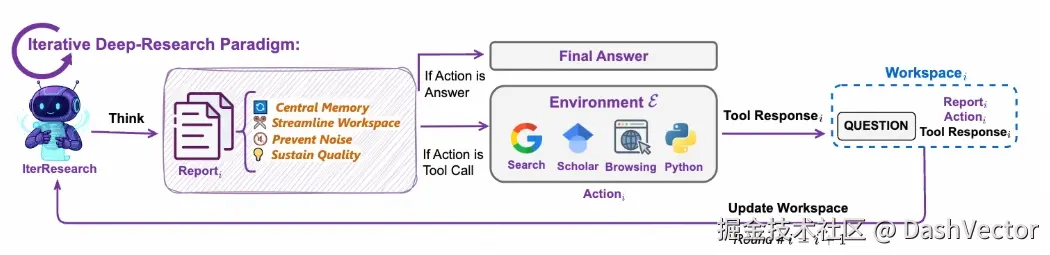 IterResearch 范式的创建是为了解决Agent将所有信息堆积在一个不断扩展的单一上下文窗口中时出现的认知瓶颈和噪音污染。针对多步研究任务,IterResearch 将其解构为一系列研究回合。