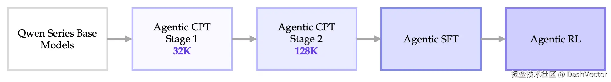 训练这样的Agent模型需要重新思考整个模型训练流程,从预训练到微调再到强化学习,我们建立了一套完整的智能体模型训练范式,将Agentic CPT → Agentic SFT → Agentic RL 连接起来,为 AI Agent创建了一个无缝的端到端训练循环。