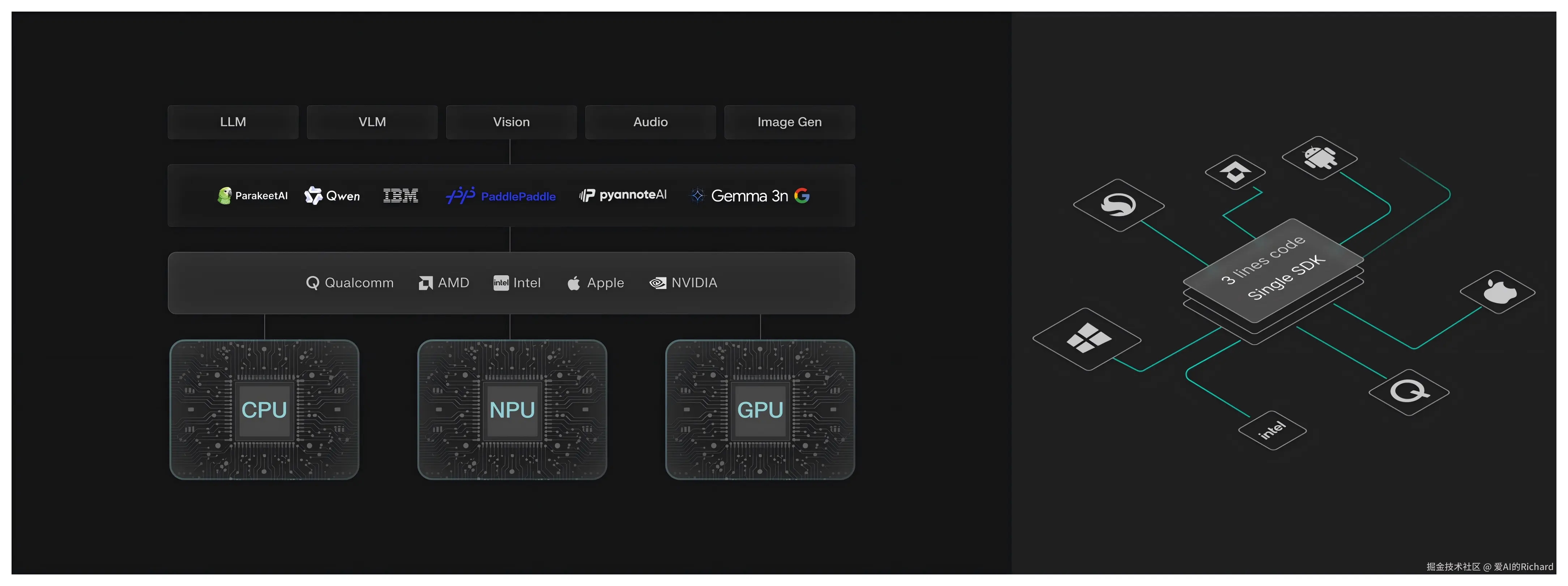 Nexa SDK实现了全平台支持,全球首次统一支持苹果NPU、Intel NPU、AMD NPU、高通 NPU 等4类NPU推理加速芯片,让端侧模型边缘推理拥有了更广泛的实现和应用场景。