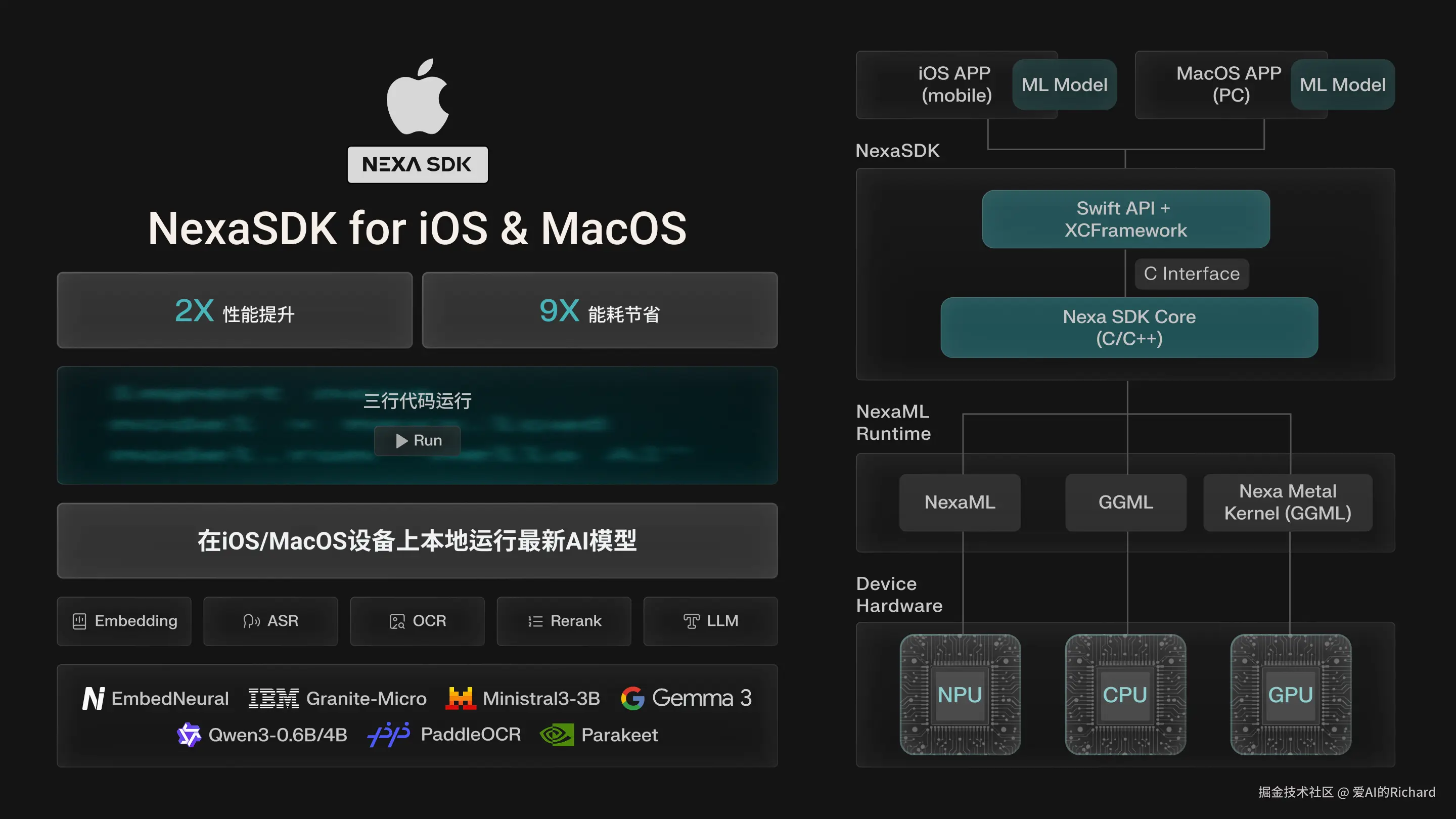 - 跨平台统一推理框架:NexaSDK 由 NexaML 引擎提供支持,该引擎是从芯片Kernel层打造的跨硬件平台统一推理引擎(支持电脑,手机,车,IoT,机器人,以及AR眼镜等设备),并支持三种端侧模型格式:GGUF 格式、MLX 格式以及 Nexa AI 自主研发的 .nexa 格式。
