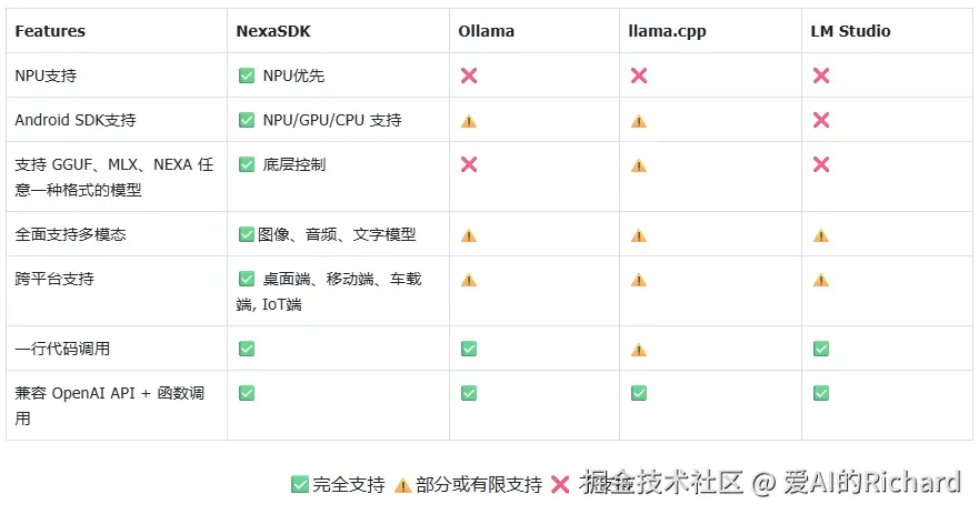Nexa SDK与其他端侧SDK的比较优势: